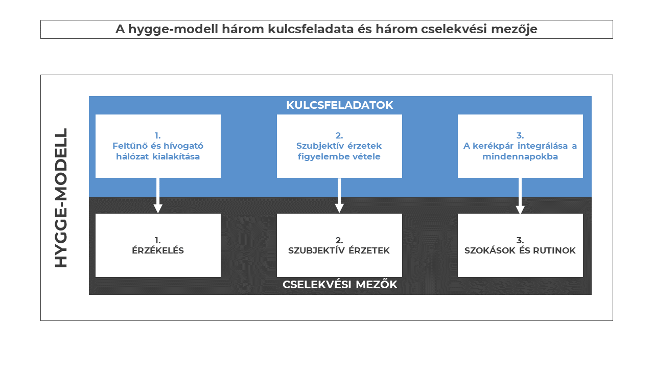 Az aktív mobilitás – ezen belül különösen a kerékpározás – hygge-modell szerinti fejlesztése elsősorban nem tervezési, hanem menedzsmentfeladat, amelynek célja tartós viselkedésváltozás elérése a közlekedésimód-választásban.