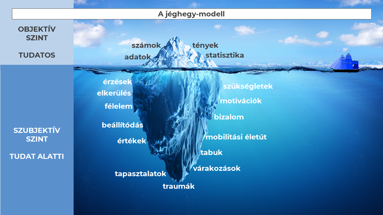 Ahogyan a jéghegynek is csak a csúcsa, töredék része látszik ki a tenger vizéből, úgy az emberi viselkedést, a vásárlási döntéseket befolyásoló gondolkodás, szempontok, érzések nagy része is rejtett, csak töredékük van az objektív, tárgyi, tudatos szinten, csak töredékük alapul megfogható pl. adatokon, számokon, tényeken.