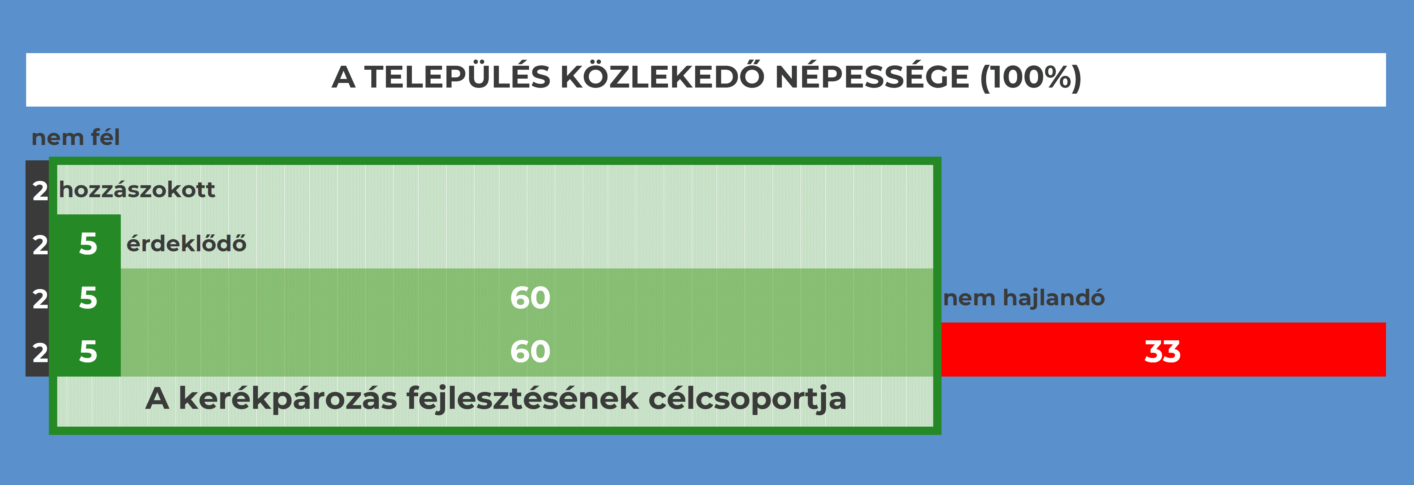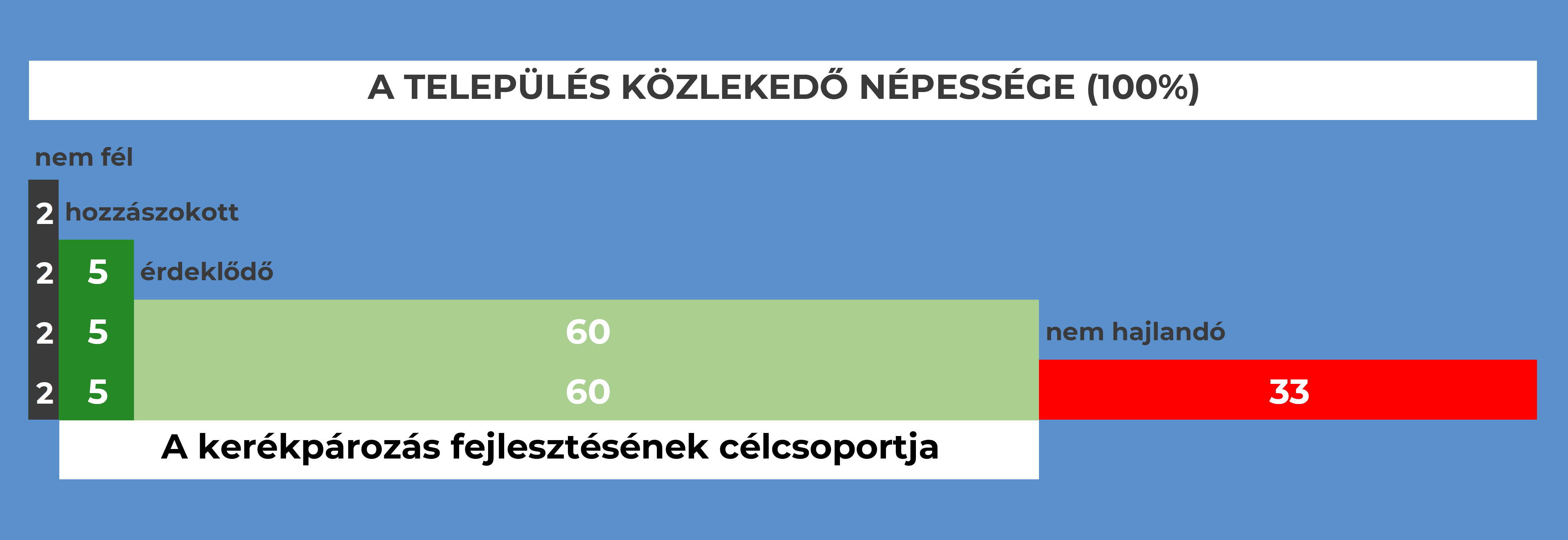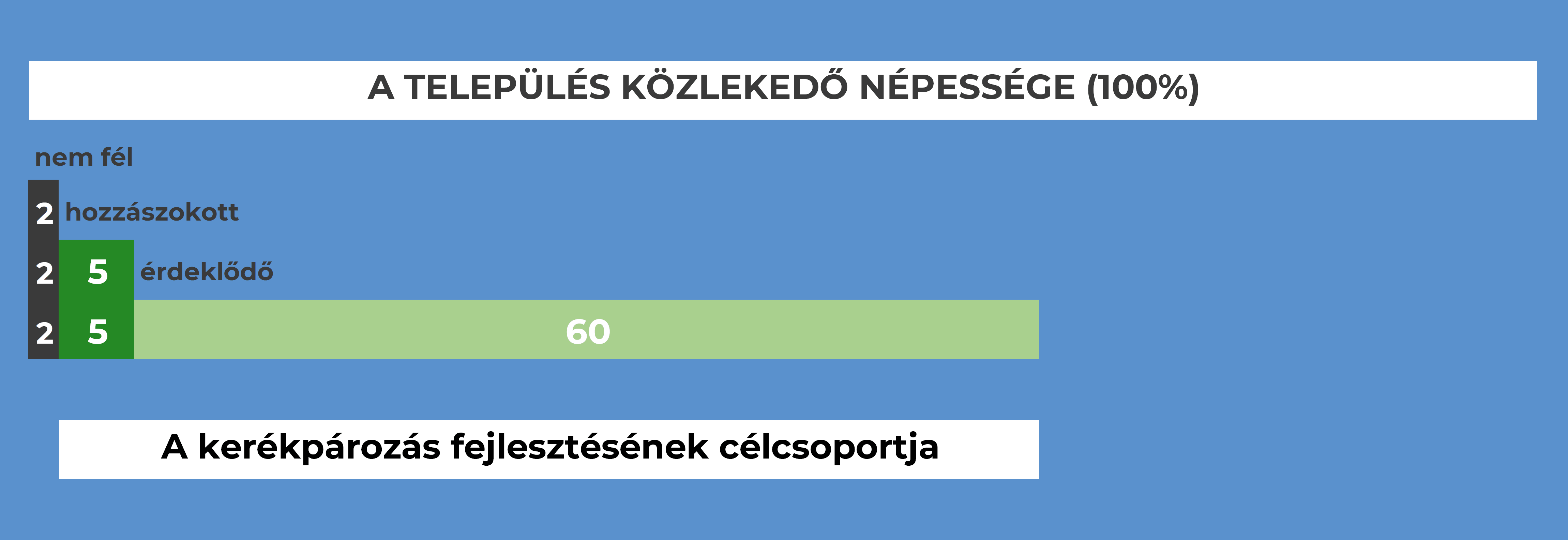 A kerékpár elérhető modal split részaránya szempontjából nagyon fontos információ, hogy az egyes városok közlekedő népességének legnagyobb része, amely eléri a 60%-ot, az érdeklődők körébe tartozik.