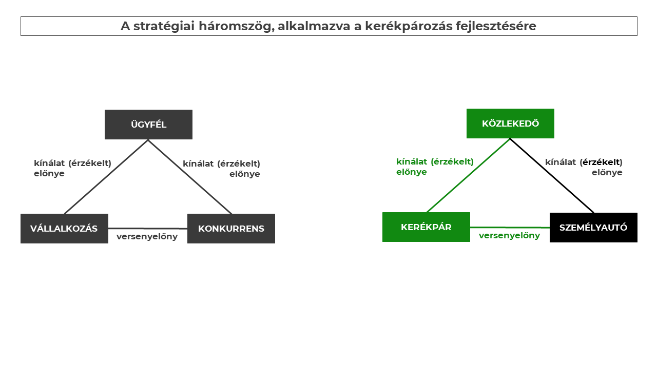 A kerékpározás részaránya a városi közlekedésben akkor fog növekedni, ha a kerékpárhasználat a városlakók (úthasználók, közlekedők) számára versenyelőnyt képes nyújtani az egyéni autóhasználattal szemben.