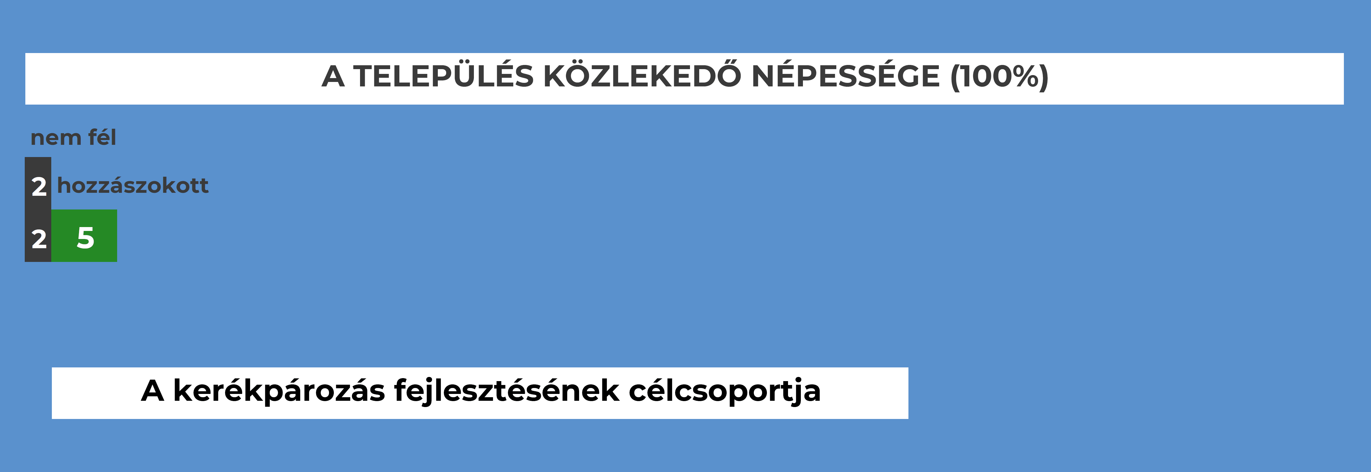 | Nem félő | 2% | munkahellyel kapcsolatos változások (távolság, bringaparkoló, öltöző, szervezeti kultúra); gyerekek növekedése; kerékpár hozzáférhetősége javul (pl. nem kell érte a pincébe lemenni) |