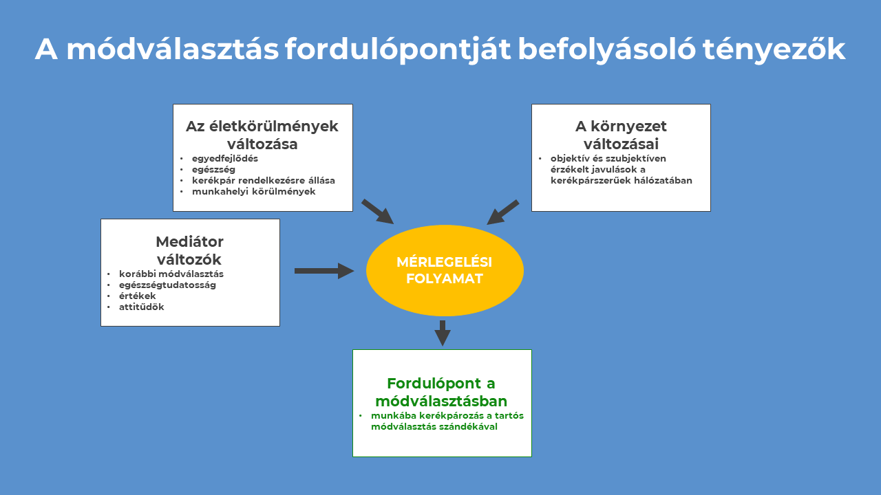 A mobilitási viselkedés változására akkor a legjobbak az esélyek, ha mindkét tényezőcsoportban megfelelő változás történik. Az, hogy adott mobilitási kínálat (úthálózat) az egyénben képes-e a módváltás kiváltására, olyan mediátorváltozóktól is függ, amelyek erősítik vagy gyengítik a tényezőcsoport hatásait.