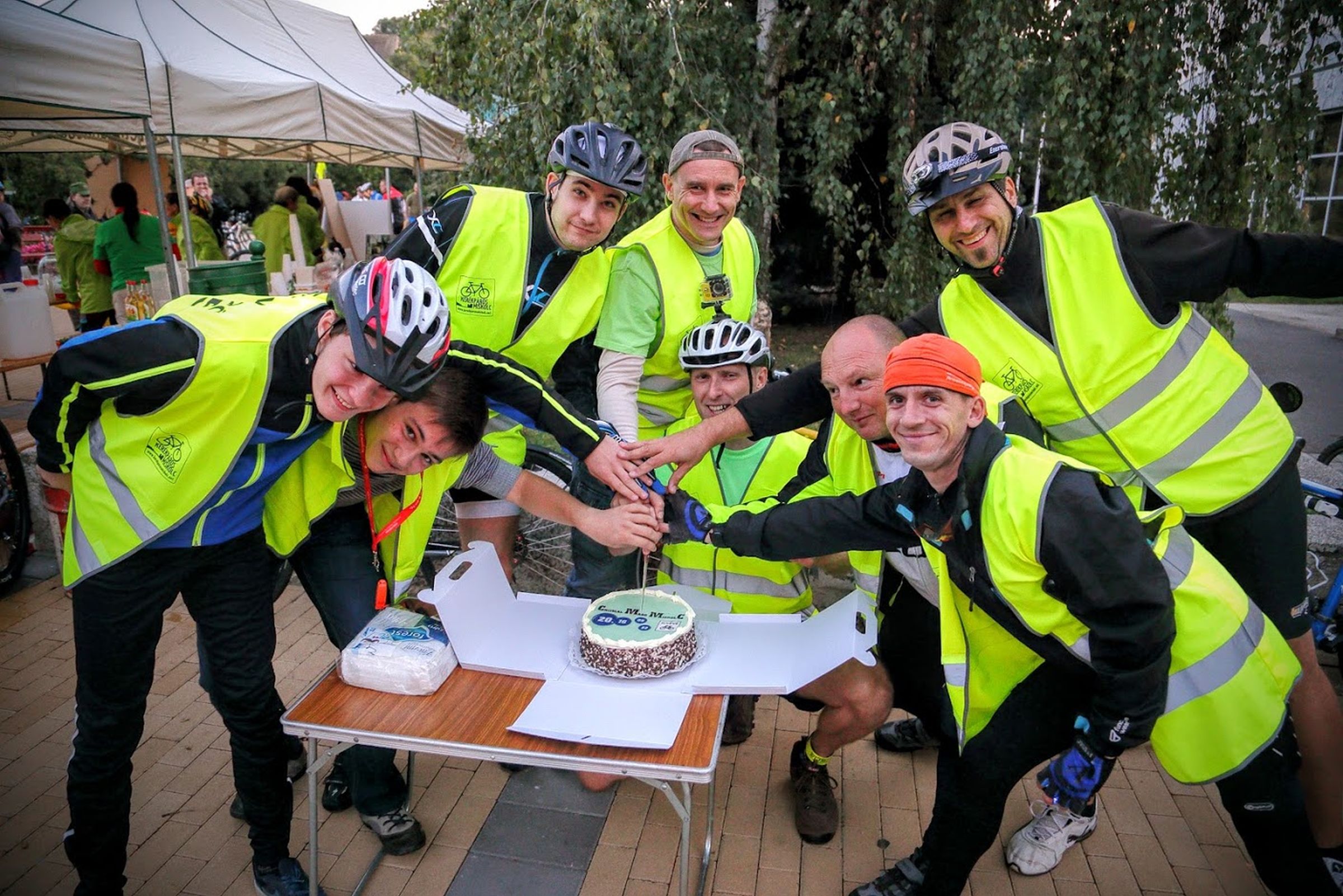 A biztosító szervezőcsapat egy része a 20. Critical Mass Miskolc felvonulás és a jól végzett munka után a jubileumi tortával