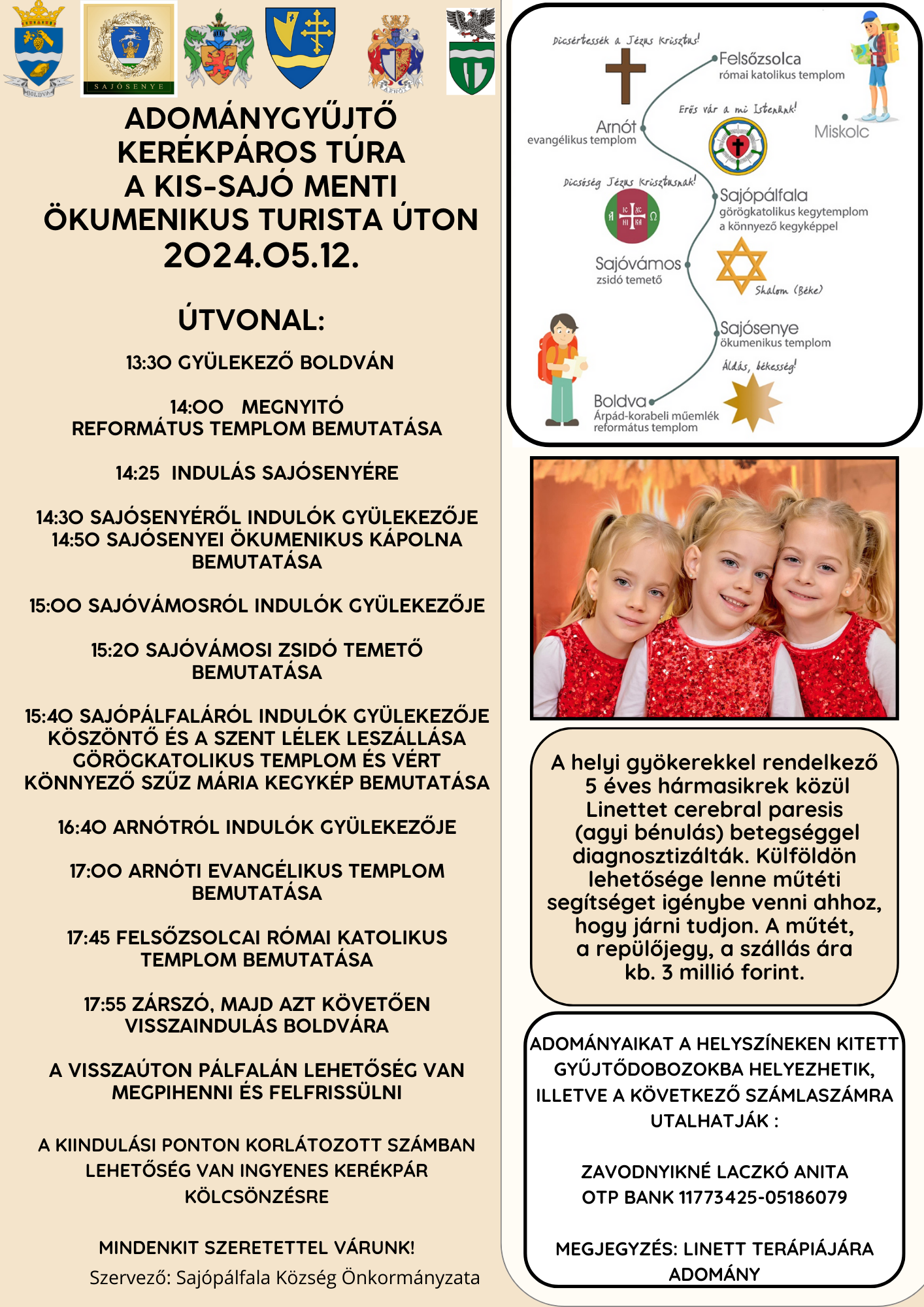 Sajópálfala Önkormányzatától érkezett a meghívó a május 12-én, vasárnap Boldváról induló, és Sajópálfalán át Felsőzsolcáig tartó jótékonysági kerékpártúrára. A részleteket az alábbi, a szervezőktől kapott plakáton találjátok. Gyertek!