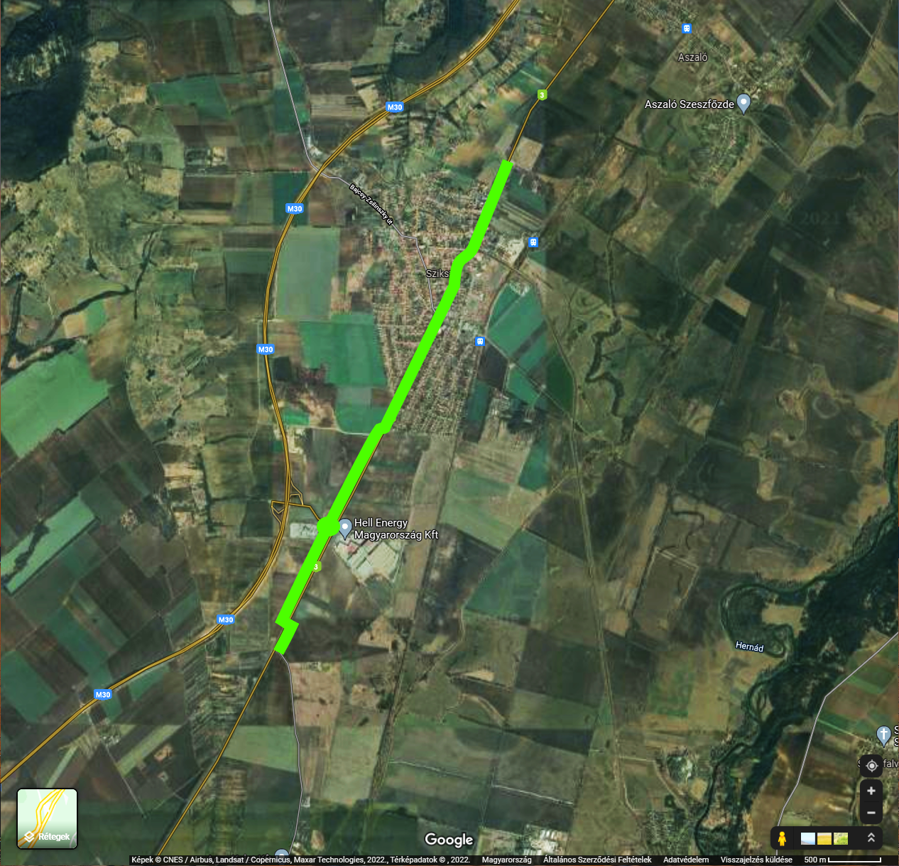 A 3701 és 3 j. utak csomópontja – Szikszó, meglévő kerékpárút kezdőpontja