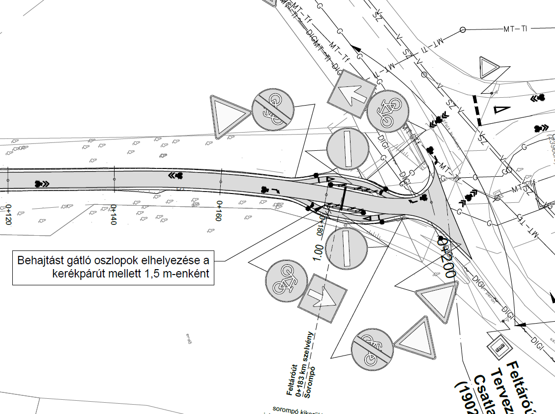 A sorompó kikerülését biztosító egyirányú kerékpárutak tervezett burkolatszélessége csak 1,00 m, ez kevés.