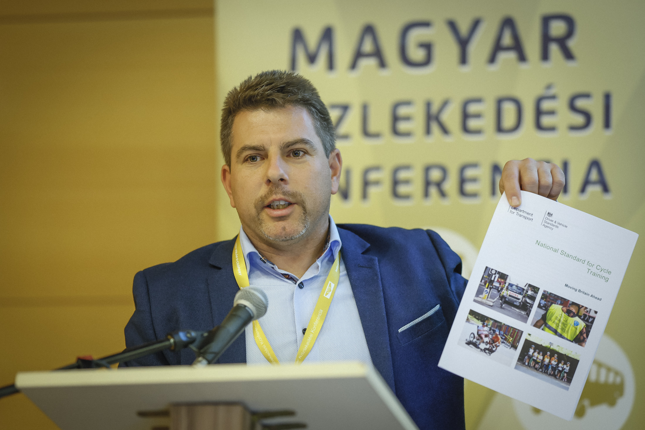 Arról beszélt, hogy hogyan fejlődött az angoloknál a kerékpározás oktatása, hogyan jutottak el a mai háromszintes (bikeability level 1, 2, 3) képzésig, és hogyan lehet ezt a gyerekek számára vonzóan, száraz elméleti előadások nélkül, mégis eredményesen csinálni.