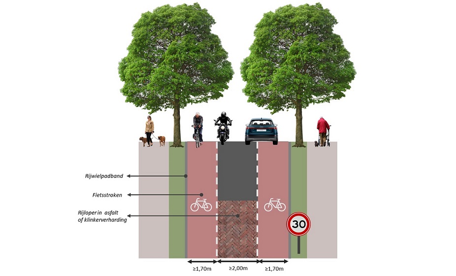 - a kerékpárok számára biztosított szélesség a hazai előírásoknak szűken ugyan megfelel, de ma már egyetlen fejlett országban sem létesítenek ennyire keskeny sávokat. A holland CROW előírása szerint 2,00 m az ajánlott és 1,70 m a minimális szélesség. Idén jelent meg az új osztrák RVS 03.02.12, amely a nyitott kerékpársávra még a legalacsonyabb szintű (D) kiépítési fokozatban is 1,00 m minimális szélességet ír elő, ehhez viszont hozzá kell adni a gépjármű forgalmi sávtól náluk kötelező 0,50 m védőtávolságot – így máris 1,50 m legkisebb szélességnél vagyunk,