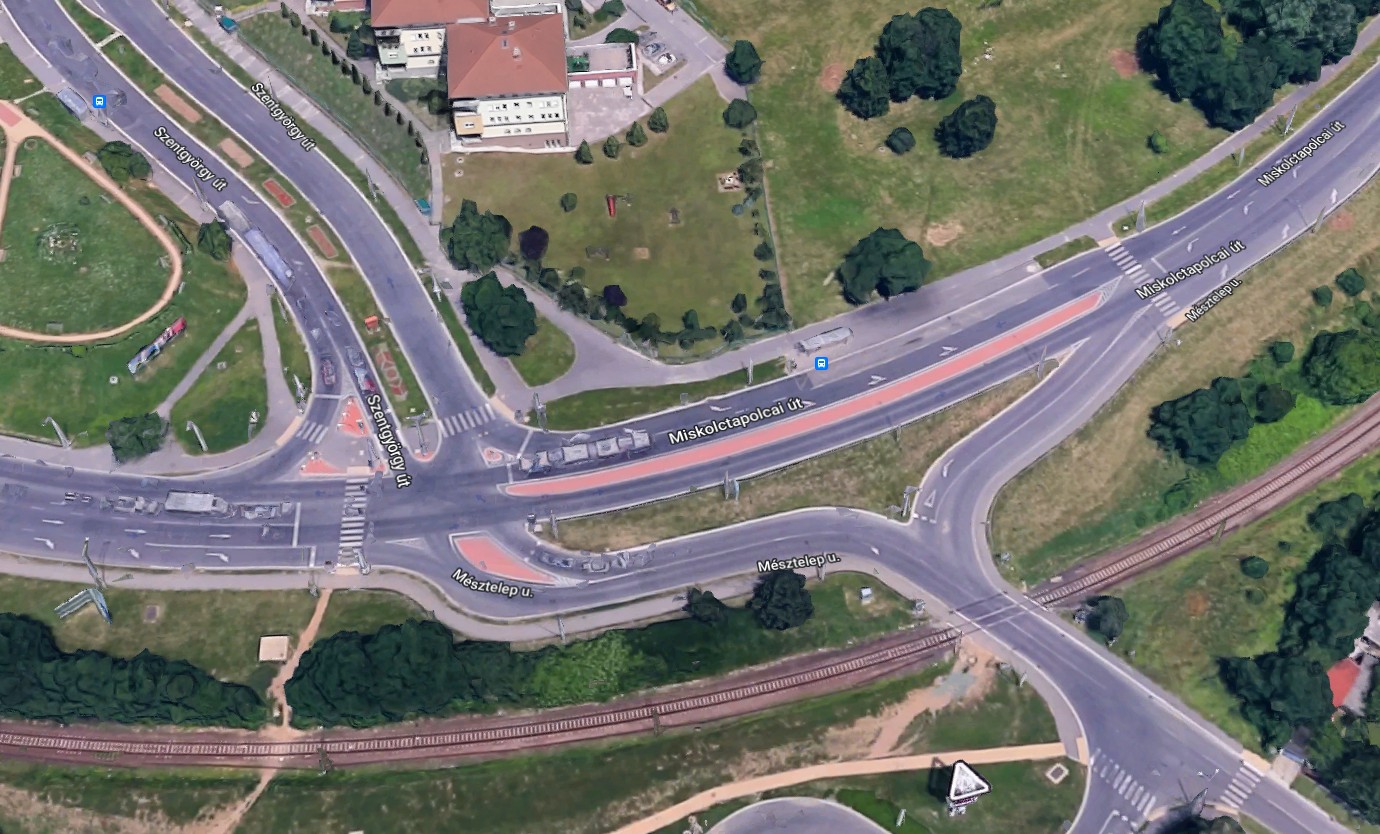 A képen jól látszik, mekkora hatalmas területet burkoltak le még a múlt században az ötletben nevesített csomóponton. Miskolcon tényleg ez lehet az egyik legburkoltabb szigetekkel épült csomópont. A hosszan elterülő sziget szinte forgalmi sáv szélességnyi. Ha ezen a felületen legalább fű nőhetne, akkor nyáron kevesebb meleget szívna magába és sugározna vissza, és a csapadékot is megkötné, esős időben kisebbek lennének a pocsolyák, és javulna a talajvíz-gazdálkodás is. Ha alacsony, az úthasználók kölcsönös észlelhetőségét nem akadályozó cserjéket is ültetnének, akkor hatékonyan tisztítaná a sok zöldre várakozó autó miatt a jelzőlámpás csomópontban különösen szennyezett levegőt is.