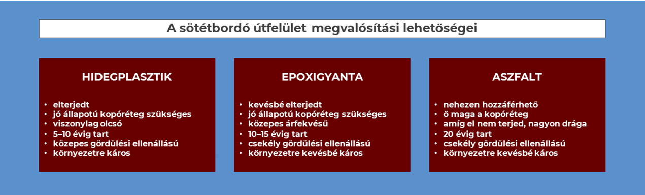 Összefoglalva: a kerékpárszerűek hálózatában javasolható a hidegplasztik és a beépített burkolati jelek tervezése, az oldószeres festékeké viszont nem.