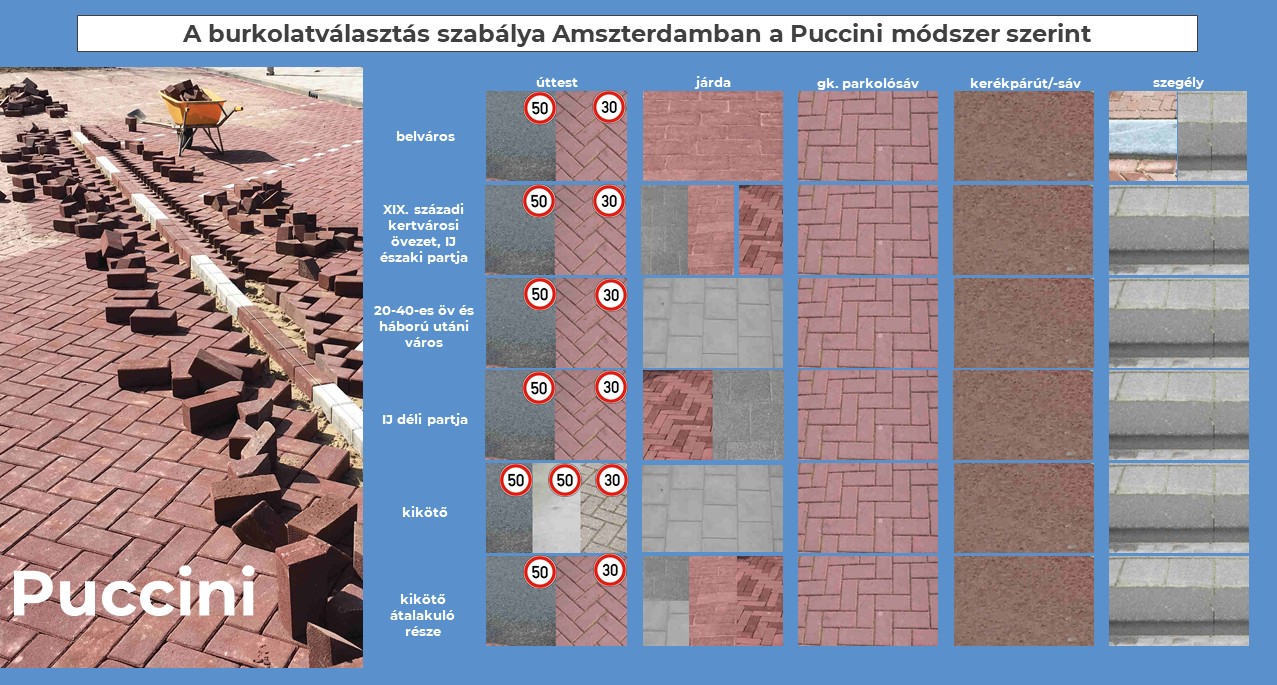 - látványos, hogy a 30 km/h sebességhatárú utca járműközlekedésre szolgáló felületeinek burkolására nem a nagyobb sebességű utakra való aszfaltot, hanem térkőburkolatot terveztek, amelynek a színe is üzenetértékű (nem aszfaltszín),