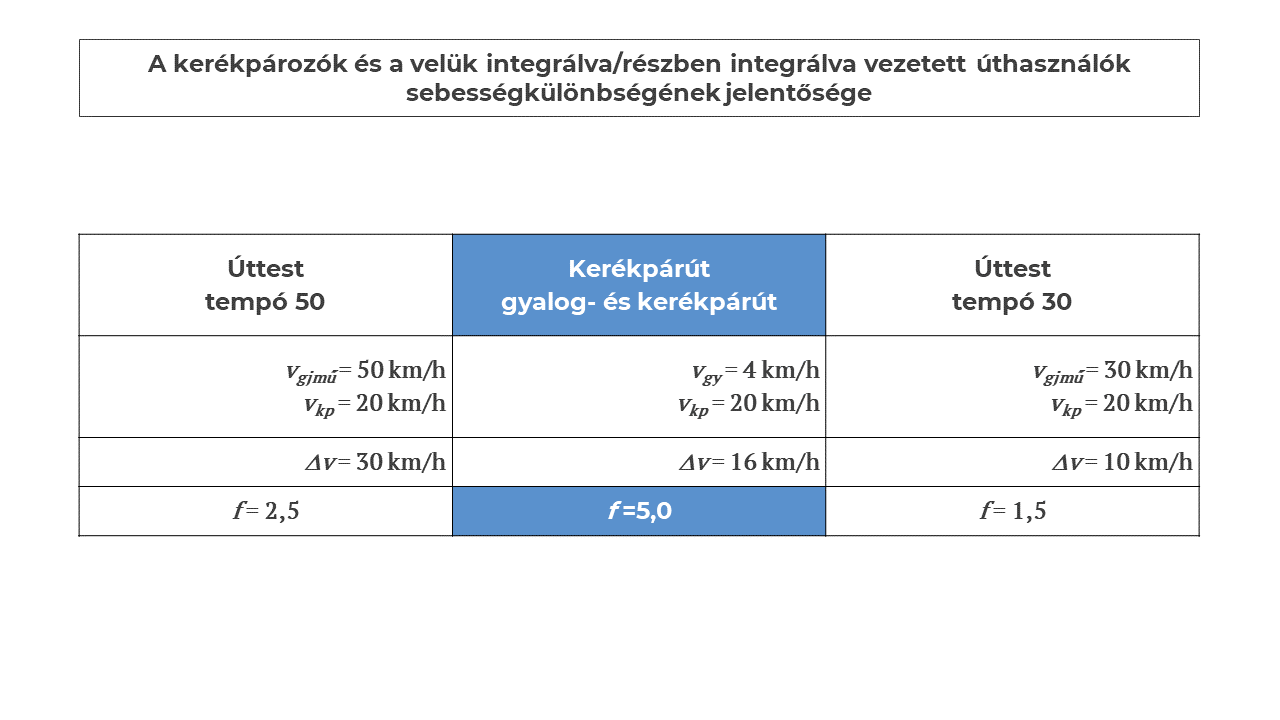 A gyalogos és a kerékpár sebességkülönbségének tényezője tehát kétszer akkora, mint a kerékpár és a gépkocsi sebességkülönbségének tényezője. Ez a nagyon jelentős sebességkülönbség akkor is rengeteg konfliktust generál gyalogló és kerékpározó között, ha éppen nem történik baj. Jól látszik, hogy lakott területen a kerékpárok és a gépkocsik sebességkülönbsége jóval csekélyebb, és ez még tovább csökken, ha az autók sebességét pl. 30 km/h-ra korlátozzák. Hiába nagyobb tehát az ütköző autó tömege, ha a szűk területre beszorítottság és a nagyobb sebességkülönbség miatt jóval nagyobb az esélye gyalogos és kerékpár, mint gépkocsi és kerékpár ütközésének.