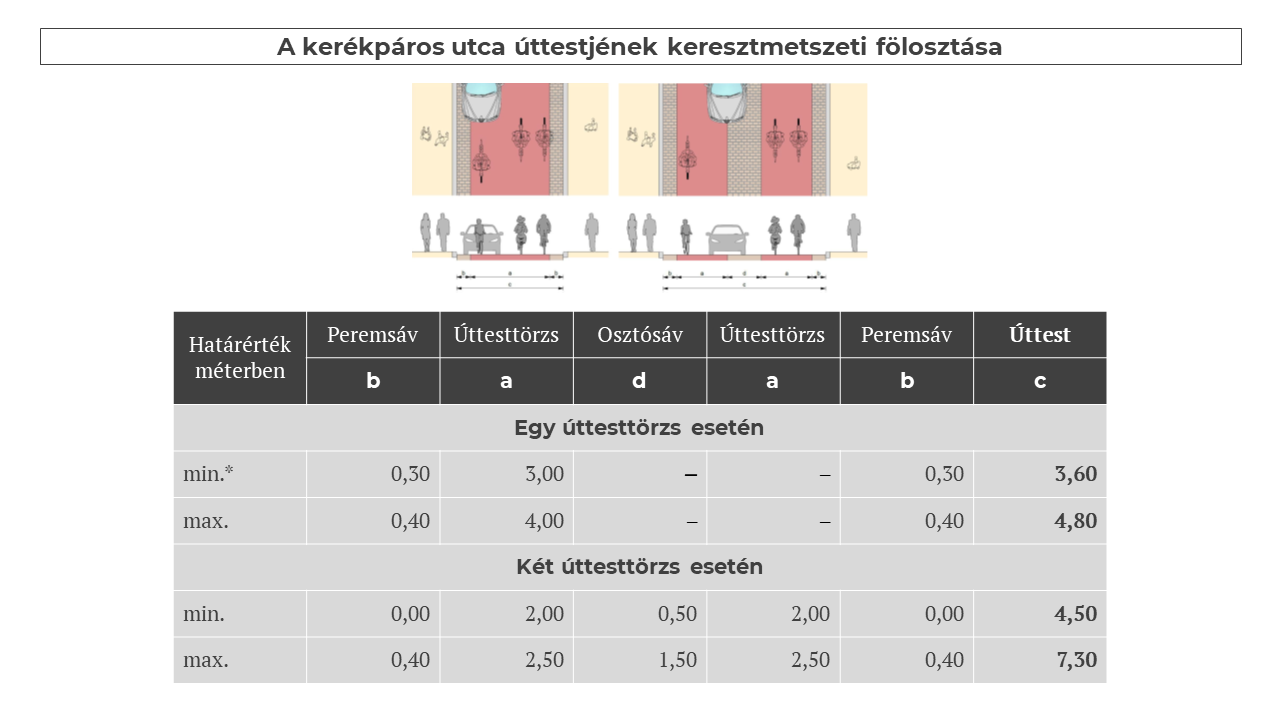 - az úttesttörzs(ek) szélessége a kerékpárutak, -sávok szélességéből vezethető le,