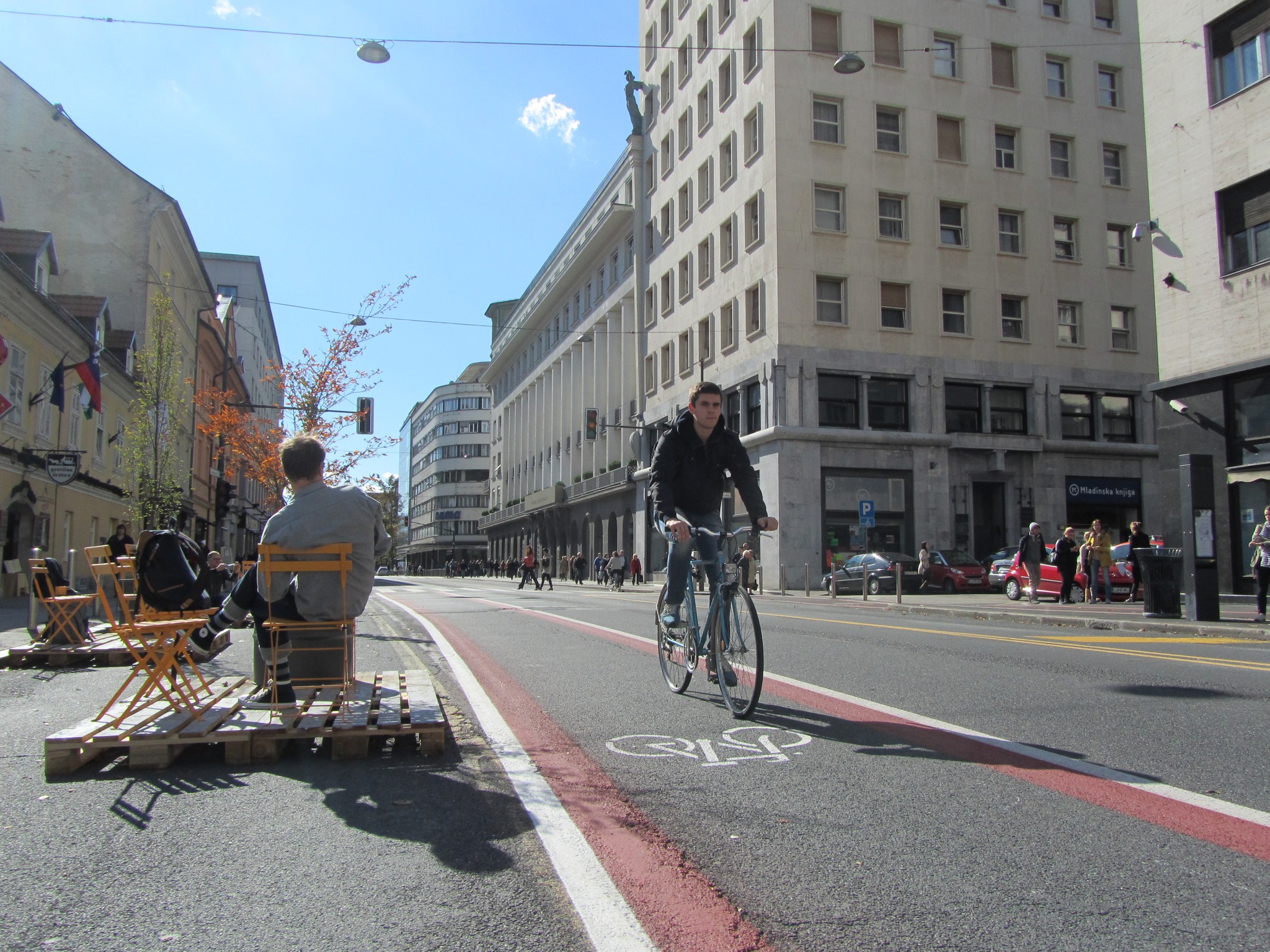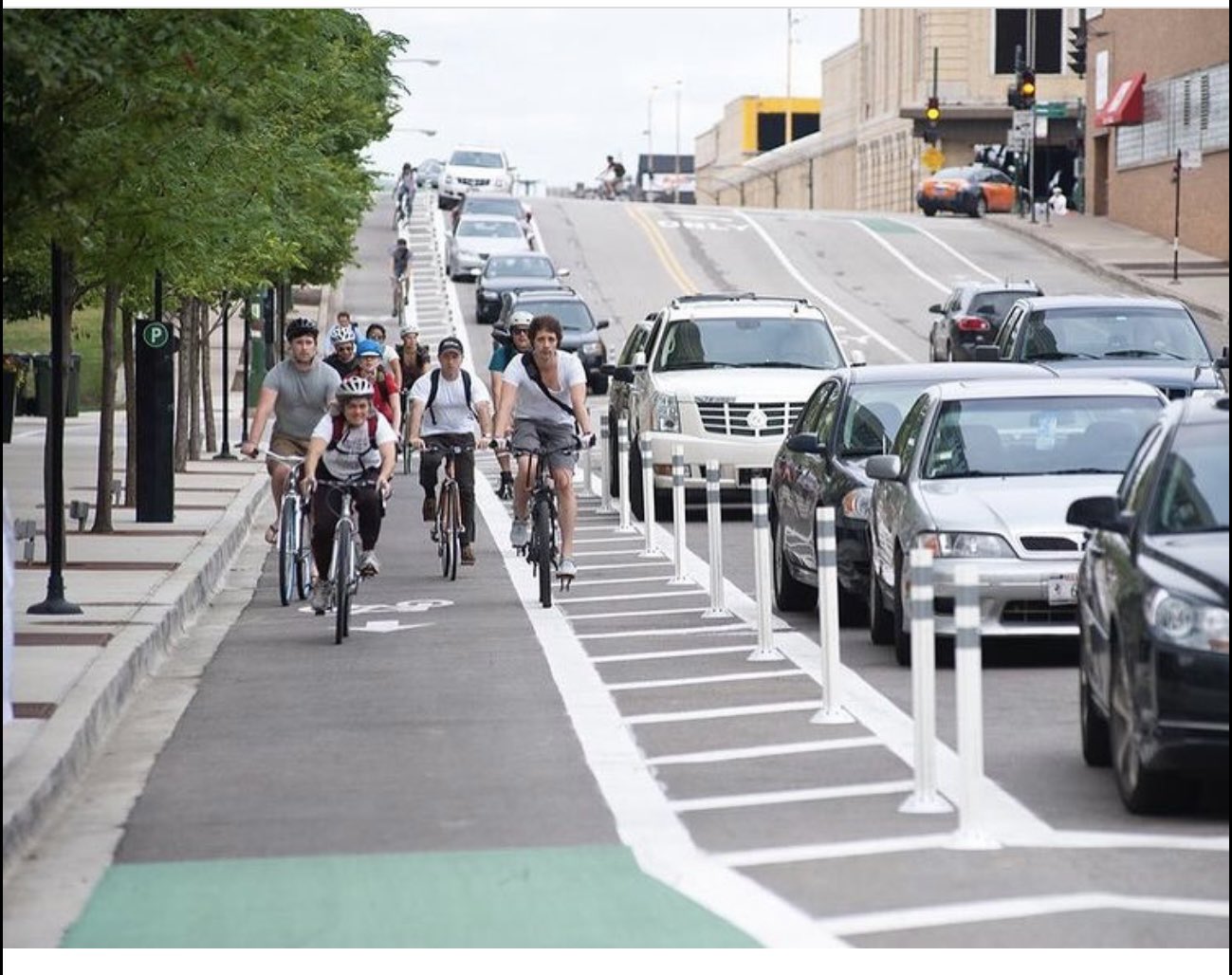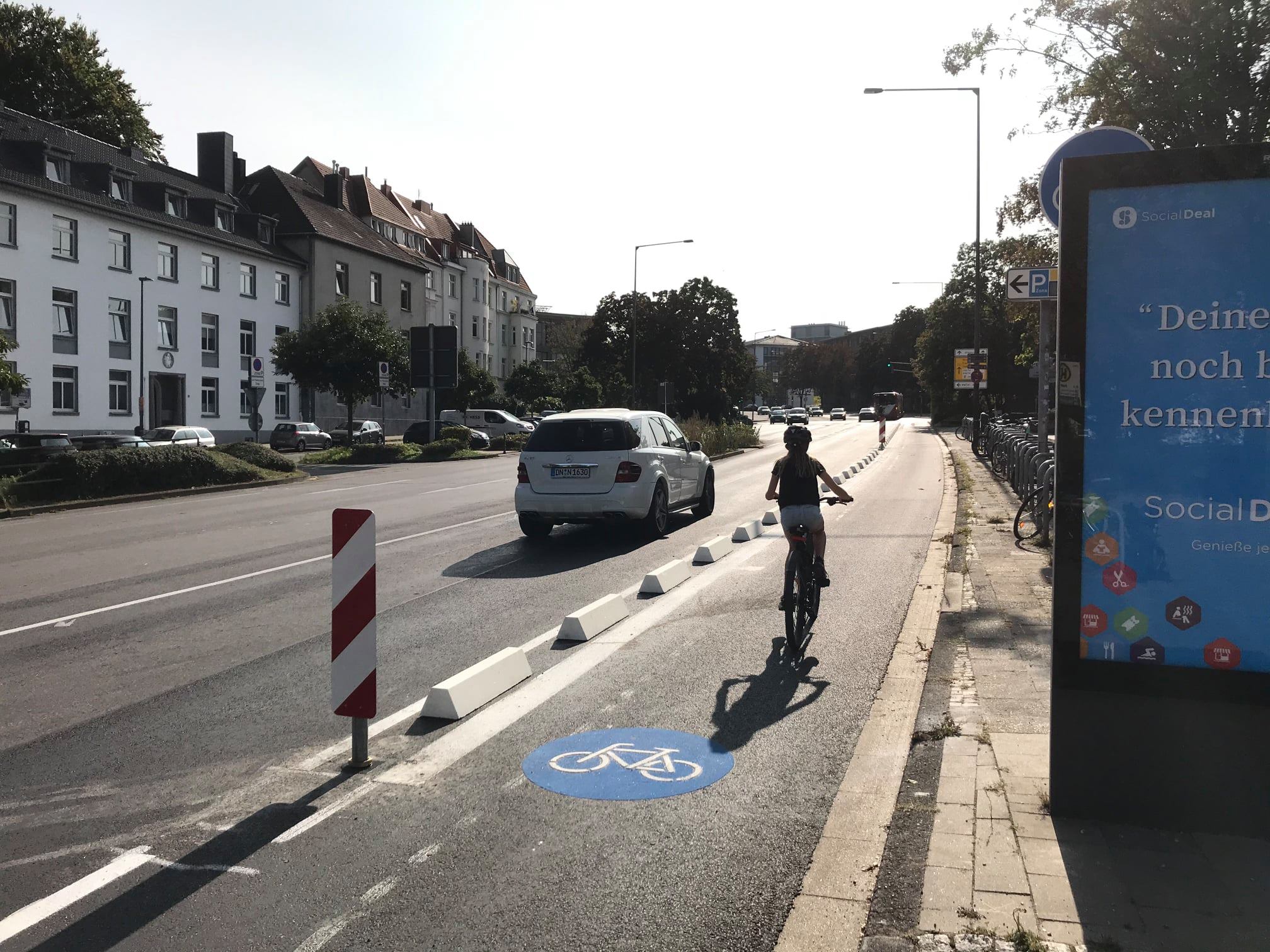 A fotón (melyet a Radentscheid Darmstadttól vettünk át) a darmstadti Rheinstraße egy részlete látható, védett kerékpársávval, jó példájaként annak, hogy hogyan lehet vonzóbbá tenni a kerékpározást, növelni biztonságát, versenyképességét.