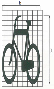 - a nagyobbik szélessége (b) 1,50 m, hosszúsága (l) 2,75 m, és az 1,80 m, vagy annál szélesebb sávokban festik fel.