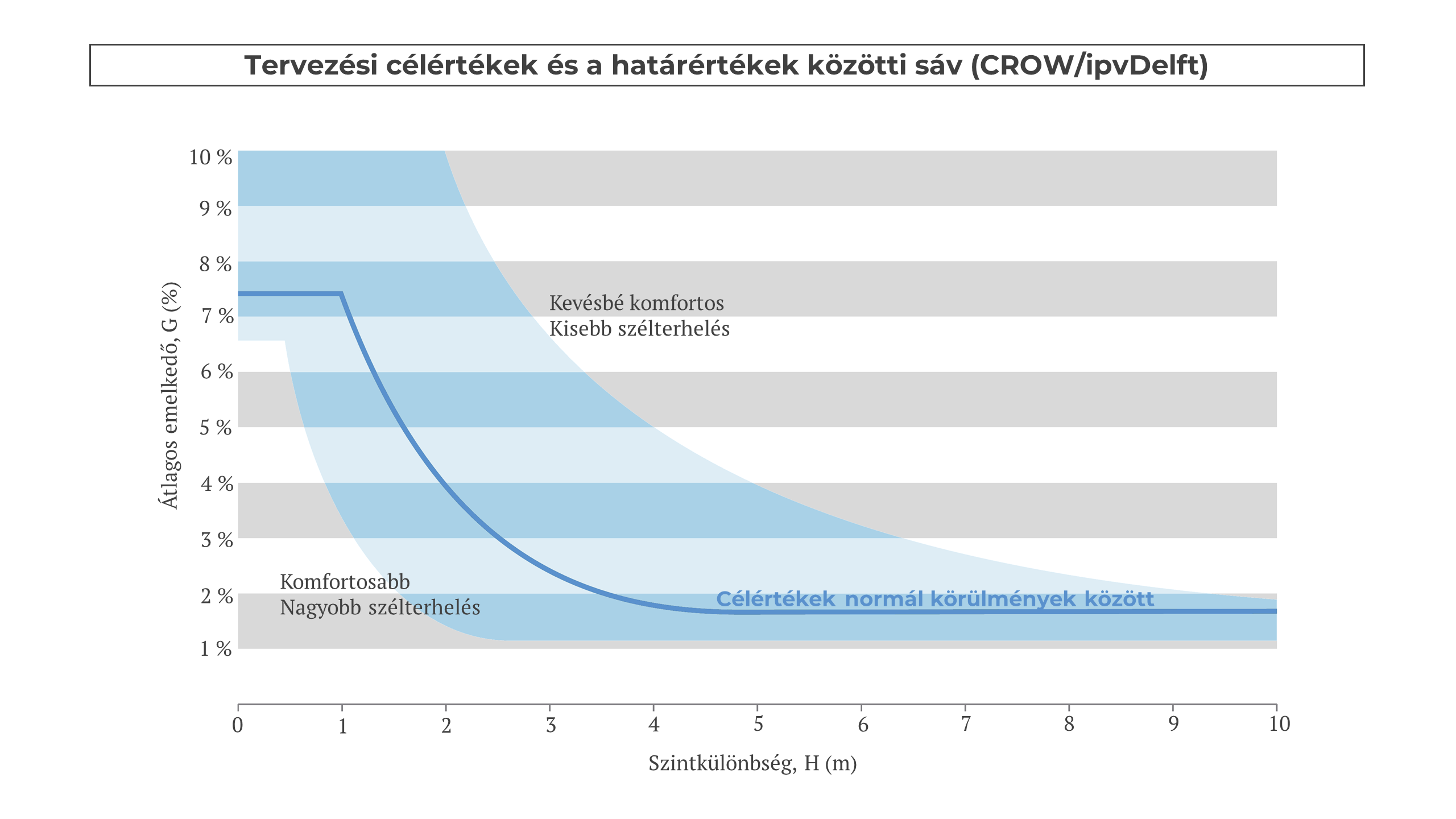 - lehetőség szerint kerülendő az 5%-nál nagyobb emelkedés, a rámpák laposak legyenek,