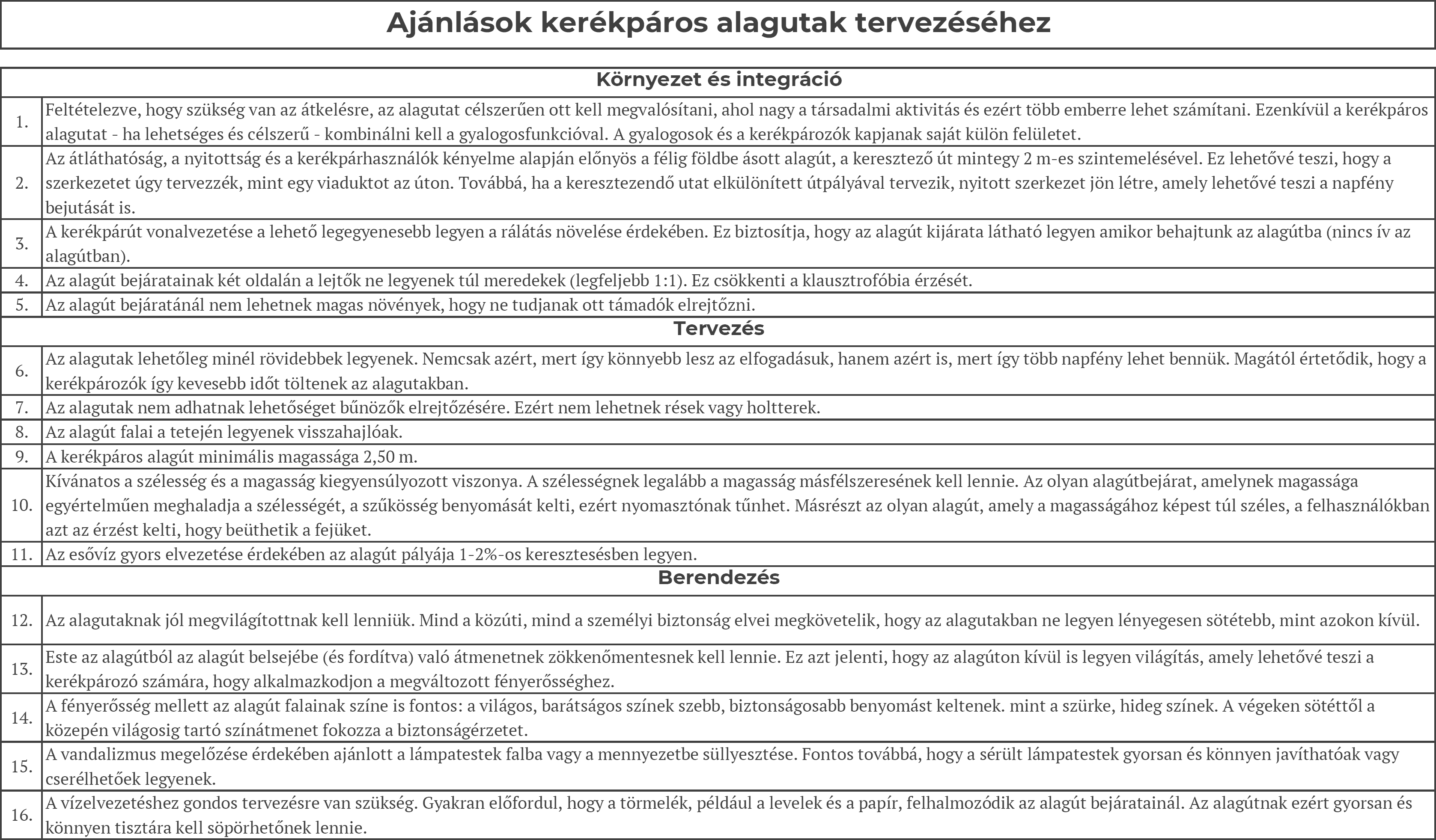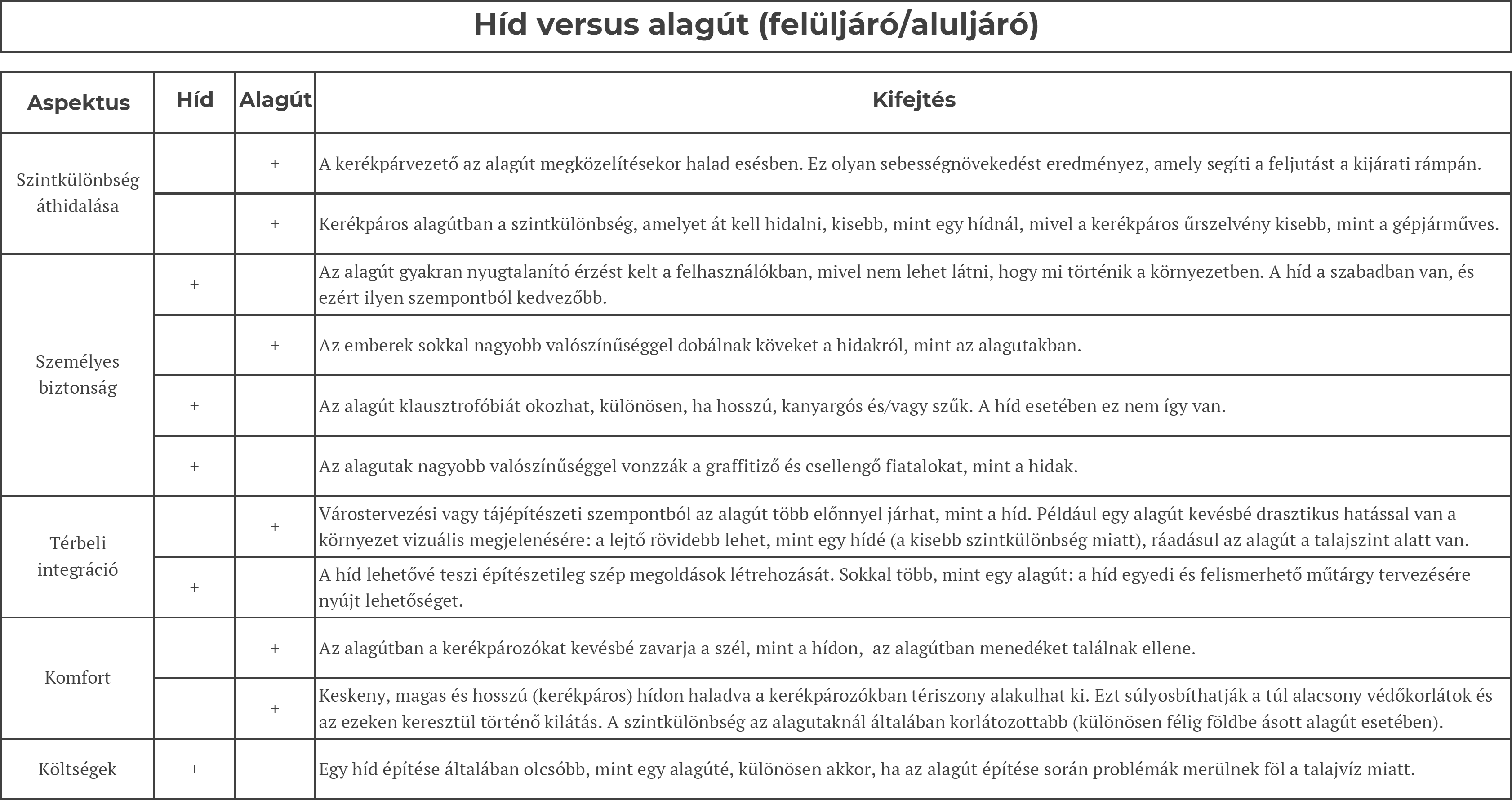 - menetdinamikai szempontból kerékpárok számára az aluljáró kedvezőbb, mint a felüljáró (először halad lejtőn, majd emelkedőn), ha azonban az ellenirányú kerékpárforgalommal (pl. ívben), vagy rágyaloglás miatt a szabad gurulás nem biztosítható, a kerékpárok sebességét korlátozni kell,- a műtárgy burkolata kerékpározásbarát legyen, leginkább aszfalt, de fahidaknál alkalmazható deszkaburkolat is,