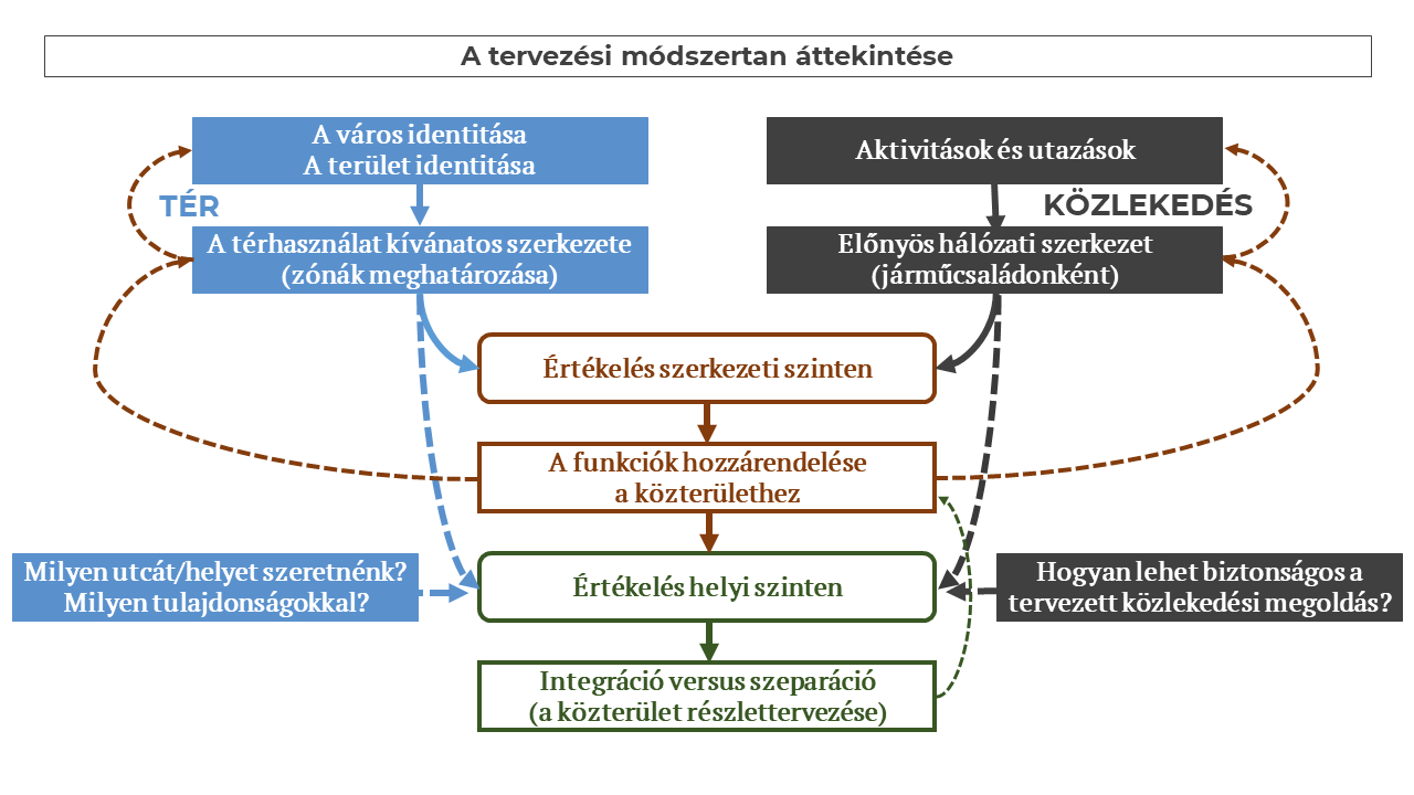 A teljes tervezési módszertanról áttekintést nyújtó ábrán fölismerhető mind a köztér és a közlekedés, mind a szerkezet és a hely szintje közötti különbségtétel.