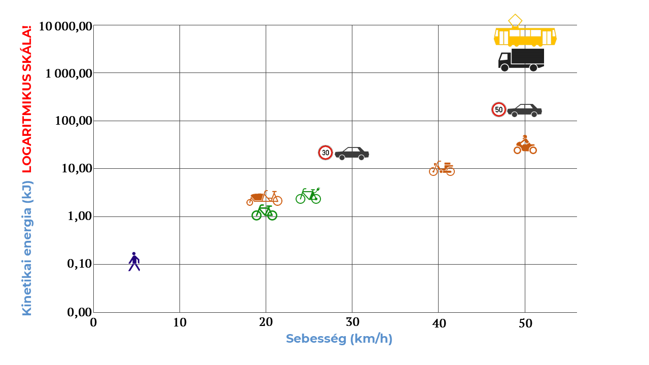 Cave: a mozgási energia (y tengely) logaritmikus skálán jelenik meg, figyelembe véve, hogy a kinetikai energia képletében a sebességkülönbségek négyzetesen számítanak. Azonban a járműtömeg-különbségek hatása sokkal nagyobb, mint a sebességkülönbségek hatása. Valójában a kerékpár (18 kg) és az autó (1200 kg) közötti tömegkülönbség megközelítőleg 60-szoros, míg a sebesség négyzete (20 km/h és 50 km/h) csak 6-szoros.