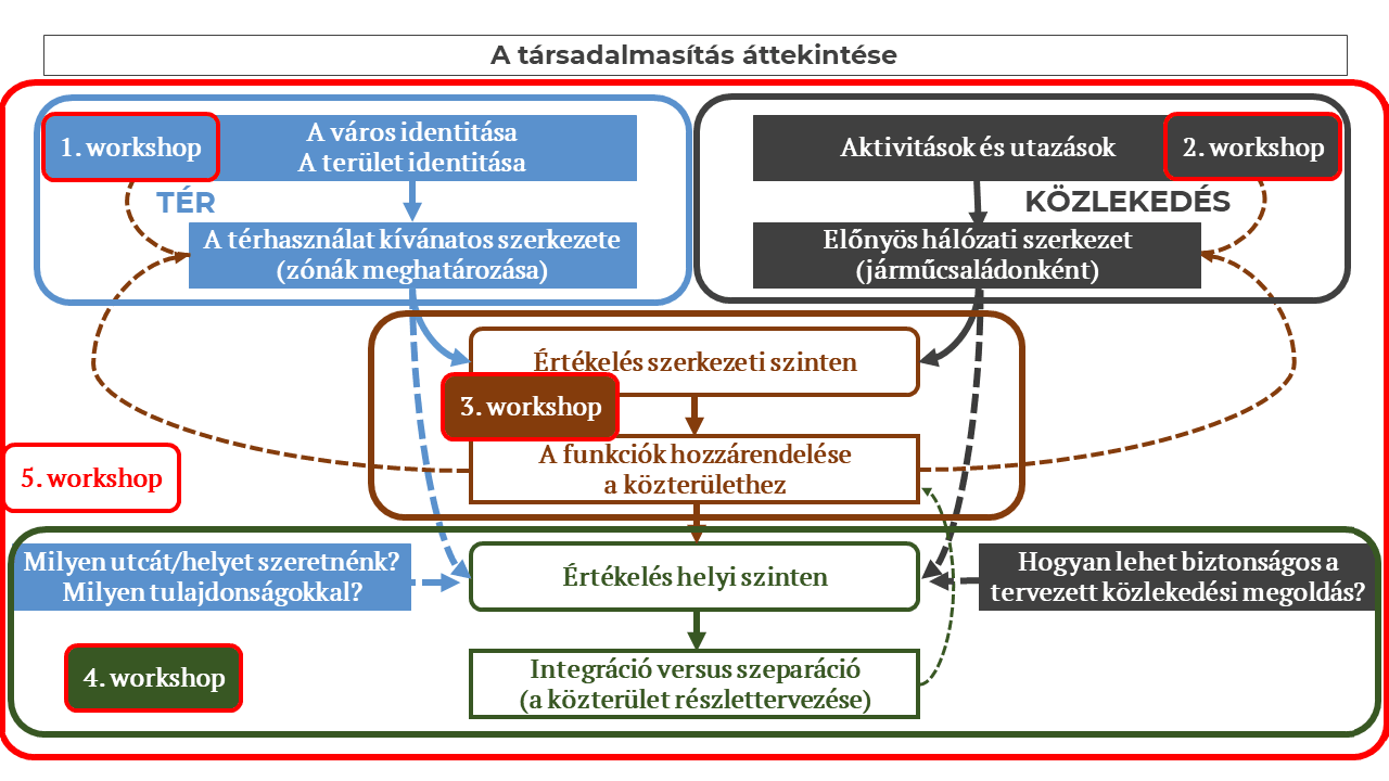 A negyedik workshopon a résztvevők a hely szintjén hoznak döntéseket annak érdekében, hogy a közterület konkrét kialakításának alapjaként elérjék a legmegfelelőbb doménekre bontást.
